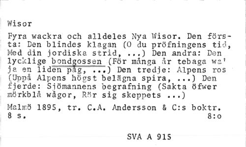 //// Wisor //// Fyra wackra och alldeles Nya Wisor. Den första: Den blindes klagan (0 du pröfningens tid, Med din jordiska strid, ...) Den andra: Den lycklige bondgossen (För många år tebaga wa' ja en liden pag, ...) Den tredje: Alpens ros (Uppå Alpens högst belägna spira, ...) Den fjerde: Sjömannens begrafning (Sakta öfwer mörkblå wågor, Rör sig skeppets ...) //// Malmö 1895 , tr. C.A. Andersson & C:s boktr. 8 s, 8:o //// SVA A 915 ////
