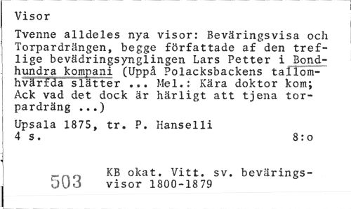 //// Visor //// Tvenne alldeles nya visor: Beväringsvisa och Torpardrängen, begge författade af den tref-lige bevädringsynglingen Lars Petter i Bond-hundra kompani (Uppå Polacksbackens tallom-hvärfda slätter ... Mel.: Kära doktor kom; Ack vad det dock är härligt att tjena tor-pardräng ...) //// Upsala 1875, tr. P. Hanselli 4 s. 8:0 //// _r. 0 KB okat. Vitt. sv. bevärings-t)Uö visor 1800-18 79 ////