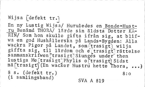 //// Wijsa fde fekt tr."] //// En ny Lustig Wijsa/ Huruledes en Bonde=Hust-ru Benämd THORA/ lärde sin äldsta Dotter KARIN/ Som hon skulle gifta ifrån sig, at blif-wa en god Hushållerska på Lands=Bygden: Alla wackra Pigor på Landet, som[trasigt") wilja giffta sig, til lärdom och e*,~trasigtj rättelse sammanskrifwenTtrasigt~! Siunges under then lustiga Me [trasigt" Phylis o ("trasigt! Sids t nä [trasigt*} (En wacker Hustru hette Thora, ...) //// 8 s. (defekt tr.) 8:0 //// (i samlingsband) SVA A gig ////