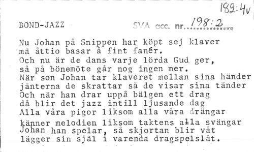 //// m-H* //// BOND-JAZZ 5VA ~cc nr //// Nu Johan på Snippen har köpt sej klaver //// mä åttio basar ä fint fanér. //// Och nu är de dans varje lörda Gud ger, //// så på bönemöte går nog ingen mer. //// När son Johan tar klaveret mellan sina händer //// jänterna de skrattar så de visar sina tänder //// Och när han drar uppå bälgen ett drag //// då blir det jazz intill ljusande dag //// Alla våra pigor liksom alla våra drängar //// känner melodien liksom taktens alla svängar Johan han spelar, så skjortan blir våt lägger sin själ i varenda dragspelslåt. ////