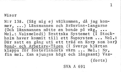 //// 1 //// Visor //// N:r 138. (Säg mig ej välkommen, då jag kommer, ...) Länsmannen och Bränvins-langarne (Och länsmannen mötte en bonde på väg, ... Mel.: Valsmelodi) Brattska Systemet (I Stockholm haver kommit till ett Supsystem ... Mel.1: Där satt en gång uti ett träd en Korp som bar) Bond- och Arbetare-Tåjen (I Sverge hjärtan klappa för fosterlandets värn ... Mel.: Ny, fin mel. Kan sjungas högt och långsamt) Vax- //// (forts) //// SVA A 1 ////