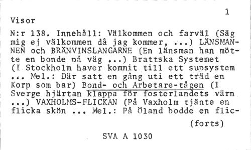 //// 1 //// Visor //// N:r 138. Innehåll: Välkommen och farväl (Säg mig ej välkommen då jag kommer, ...) LÄNSMANNEN och BRÄNVINSLANGARNE (En länsman han mötte en bonde nå väg ...) Brattska Systemet (I Stockholm haver kommit till ett supsystem ... Mel.: Där satt en gång uti ett träd en Korp som bar) Bond- och Arbetare-tågen (I Sverge hjärtan klaopa för fosterlandets värn ...) VAXHOLMS-FLICKAN (På Vaxholm tjänte en flicka skön ... Mel.: På Öland bodde en flic- //// (forts) //// SVA A 10 30 ////