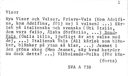 //// Visor //// Nya Visor och Valser. Friare-Vals (Kom Adolfina, kom Adolfina, följ mej i valsen!...) Kärlek på italienska och svenska c Uti Italio, dom vara falio, Älska förfärlio, - 1 Rond-Vals fGulla lilla, ljufligt är att valsa med dej, ...) Italiensk Vals (All kärlek som blänker, blänker på ytan så klar, ...) Jeanet i den gröna skog (Men Jeanet, säg hvad betyder nu dock detta? ...) Vikbolands-Polka (För kän- //// (forts) //// SVA A 739 ////