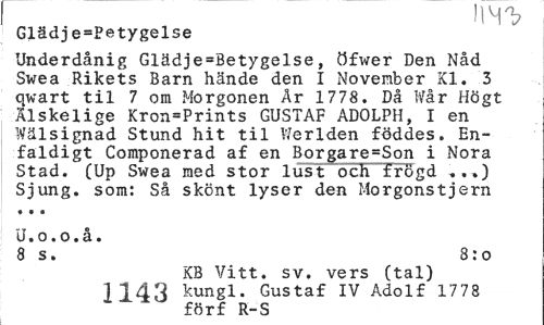 //// : t //// Glädj e=Petygelse //// Underdånig Glädje=Betygelse, öfwer Den Nåd Swea Rikets Barn hände den I November XI. 3 qwart til 7 om Morgonen År 1778. Då Wår Högt Älskelige Kron=Prints GUSTAF ADOLPH, I en Wälsignad Stund hit til Werlden föddes. Enfaldigt Componerad af en Borgare=Son i Nora Stad. (Up Swea med stor lust och frögd ...) //// Sjung, som: Så skönt lyser den Morgonstjern » • » //// U.o.o.å. //// 8 s. 8: o //// KB Vitt. sv. vers (tal) 1143 kungl. Gustaf IV Adolf 1778 förf R-S ////