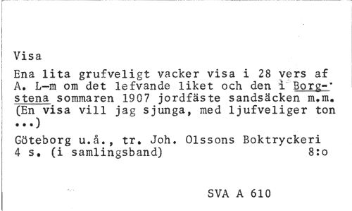 //// Visa //// Ena lita grufveligt vacker visa i 28 vers af A. L-m om det lefvande liket och den i Borg-' stena sommaren 1907 jordfäste sandsäcken m.m. (En visa vill jag sjunga, med ljufveliger ton //// Göteborg u.å., tr. Joh. Olssons Boktryckeri 4 s. (i samlingsband) 8:o //// SVA A 610 ////