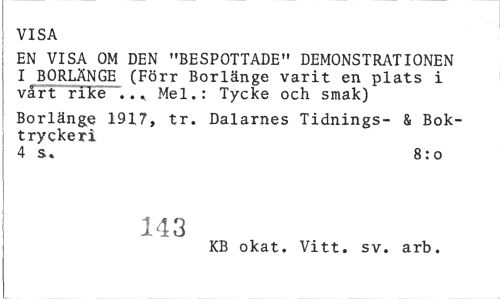 //// VISA //// EN VISA OM DEN "BESPOTTADE" DEMONSTRATIONEN I BORLÄNGE (Förr Borlänge varit en plats i värt rike ... Mel.: Tycke och smak) //// Borlänge 1917» tr. Dalarnes Tidnings- & Boktryckeri //// 4 s. 8:0 //// 143 //// KB okat. Vitt. sv. arb. ////