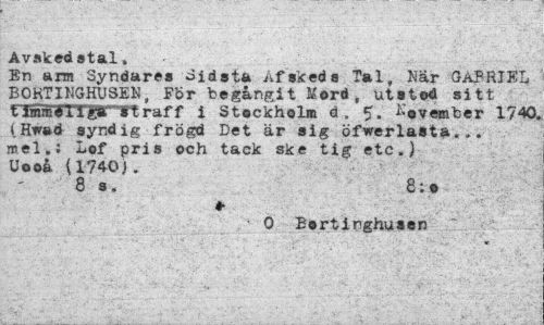 //// Avskedstal, //// En arm Syndares Sidsta Afskeds Tal, När GABRIEL BOKTINGHUSEN, Fi>r fceg&ngit Mord, utstod sitt timroéligrrtraff i Stockholm d. Kovemher 1740. (Hwad syndig frögd Det är sig öfwerlasta... mel,: Lof pris och tack ske tig etc.) Uooå. (1740). //// 8 s. 8:0 //// *¦ //// O Bortinghusen ////