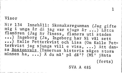 //// 1 //// Visor //// N:r 134 Innehåll: Skomakaregumman (Jag gifte mig i unga år då jag var tjugo år ...) Lätta flanören (Jag är finess, flanera uti staden ..,) Ingeborg (Ja, Ingeborg har Ni väl sett ...) Kalle Petterkvist och Lisa (Om Kalle Petterkvist jag sjunga vill e visa, ...) Att dansa ÄQÅiiiiLYaljS(Damernas historia säges stora minnen ha, ...) Ä du mä1 på dä'? (Mi1 jänta //// (forts) //// SVA A 485 ////