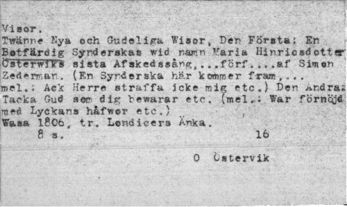 //// Visor. //// Twänr-e Kya och Guöeliga Wisor, Der? Första; En Botfärdig Synderskas wid nawn Faria Hinriesd otter CsterwJTS sista Af »kedssång,., „fSrf... .af Simon Zedermar,. (En Synderska här kommer fram,... mel.; Ack Herre straffa icke mig etc.) Den Andra; Tacka Gud sop dig "bewarar etc. (mel. i War förnqjd ?ned Lyckans håfwor etc.) , //// Wasa 1806, tr. Londicers Anka. //// 8 s. 16 //// 0 Cstervik ////