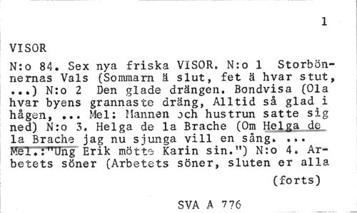 //// 1 //// VISOR //// N:o 84. Sex nya friska VISOR. N:o 1 Storbön-nernas Vals (Sommarn ä slut, fet ä hvar stut, ...) N:o 2 Den glade drängen. Bondvisa (Ola hvar byens grannaste dräng, Alltid så glad i hågen, ... Mel; Mannen :>ch hustrun satte sig ned) N:o 3. Helga de la Brache (Om He|ga de la Brache jag nu sjunga vill en sång. ... Hel. ."'Ung Erik mötte Karin sin.") N:o 4. Arbetets söner (Arbetets söner, sluten er alla //// (forts) //// SVA A 7?6 ////