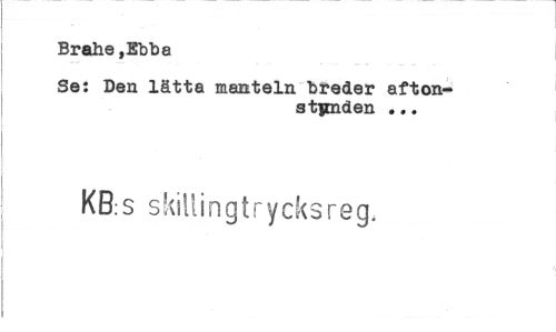 //// Brahe,Ebba //// Se: Den lätta manteln breder aftonstunden ... //// KB:S skillingtrycksreg. ////