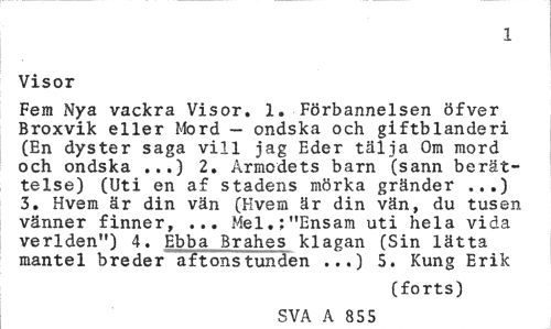 //// 855 //// Visor //// Fem Nya vackra Visor. 1. Förbannelsen öfver Broxvik eller Mord - ondska och giftblanderi (En dyster saga vill jag Eder tälja Om mord och ondska ...) 2. Armodets barn (sann berättelse) (Uti en af stadens mörka gränder ...) 3. Hvem är din vän (Hvem är din vän, du tusen vänner finner, ... Mel.:"Ensam uti hela vida verlden") 4. Ebba Brahes klagan (Sin lätta mantel breder aftonstunden ...) 5. Kung Erik //// (forts) //// SVA A 217 ////