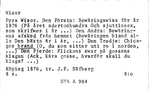 //// Wisor //// Fyra Wisor. Den Första: Bewäringswisa för år 1876 (På året adertonhundra Och sjuttiosex, som skrifwes i år ...) Den Andra: Bewäring-ens afsked från hemmet (Bewäringen bland alla Den bästa är i år, ...) Den Tredje: Chicagos brand (0, du som sitter uti ro i norden, ...) Öen Fjerde: Flickans swar på gossens klagan (Ack, kära gosse, hvarför skall du klaga? ...) //// Köping 1876, tr. J.F. Säfberg 8 s. 8:o //// SVA A 964 ////