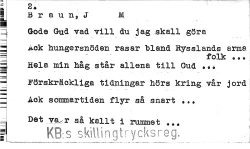 //// 2* //// B r a u i. J M //// m //// q. Gode Gud vad vill du jag skall göra //// g .ack hungersnöden rasar bland Hysslands arma J folk •.. //// 3 Hela min håg står allena till Gud //// | Förskräckliga tidningar hörs kring vår jord //// Z Ack sommartiden flyr så snart •.. //// f. Det va. r så kellt i rummet ... //// f' KB:S skillingtrycksreg. ////