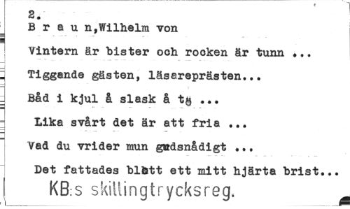 //// 2. //// B r a u n,Wilhelm von //// Vintern är bister och rocken är tunn ... . Tiggande gästen, läsareprästen... J Båd i kjul å slask å tö ... //// Lika svårt det är att fria ... Vad du vrider mun godsnådigt ... Det fattades blött ett mitt hjärta brist... //// KB:s skillingtrycksreg. ////