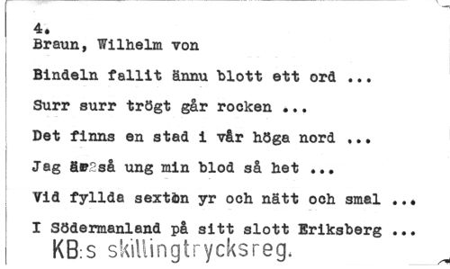 //// 4. //// Braun, Wilhelm von //// Bindeln fallit ännu "blott ett ord ... //// Surr surr trögt går rocken ... //// Det finns en stad i vår höga nord ... //// Jag ä»2så ung min blod så het ... //// Tid fyllda sextfcn yr och nätt och smal ..• //// I Södermanland på sitt slott Eriksberg ... //// KB:S skillingtrycksreg. ////