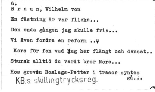 //// 6. //// B r a u n, Wilhelm von En fästning är var flicka... Den enda gången jag skulle fria... Vi även förära en reform • Kors för fan vad $ag har flängt och dansat.. Stursk alltid du varit bror Nore... I Hos grevén Roslags-Petter i trasor syntes //// KB.s skiUingtrycksreg. så--* ////