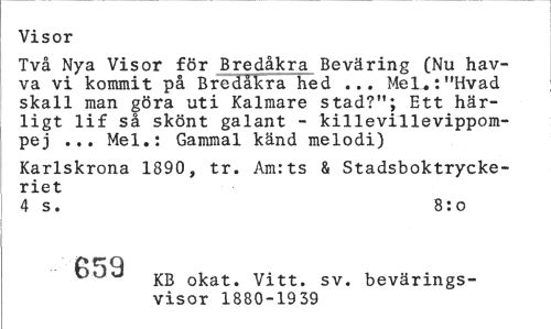 //// Visor //// Två Nya Visor för Bredåkra Beväring (Nu hav-va vi kommit på Bredåkra hed ... Mel.:"Hvad skall man göra uti Kalmare stad?"; Ett härligt lif så skönt galant - killevillevippom-pej ... Mel.: Gammal känd melodi) //// Karlskrona 1890, tr. Am:ts & Stadsboktryckeriet //// 4 s. 8:0 //// KB okat. Vitt. sv. bevärings-visor 1880-1939 ////