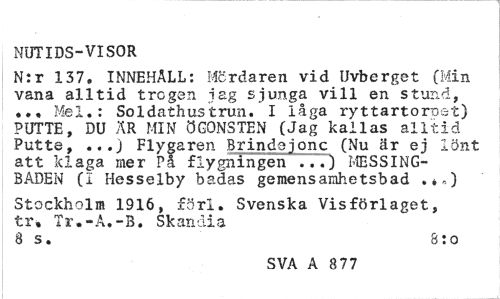 //// NUTIDS-VISOR //// N:r 137, INNEHÅLL: Mördaren vid Uvberget (Min vana alltid trogen iag sjunga vill en stund, ... Mel.: Soldathustrun. I låga ryttartoroet) PUTTE, DU ÄR MIN ÖGONSTEN (Jag kallas alltid Putte, ...j Flygaren Brindejonc (Nu är ej lönt att klaga mer På flygningen ...) MESSING-BADEN (I Hesselby badas gemensamhetsbad .*») //// Stockholm 1916, förl. Svenska Visförlaget, //// tr, Ir.-A.-B. Skandia //// 8 s. 8:o //// SVA A 877 ////