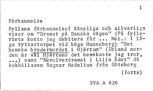 //// 1 //// Förbannelse //// Fyllans förbannelse! Känsliga och allvarliga visor om "Dramat på Danska vägen" (På fylleriets konto jag debitera får ... Mel.: I låga ryttartorpet vid höga Hunneberg) "Det hemska brodermordet i Hjärtum" (Ibland morden är väl Hjärtums det hemskaste jag tror, ...) samt "Revolverdramat i Lilla Edet" då bokhållaren Ragnar Hedelius från Göteborg //// (forts) //// SVA A 6 26 ////