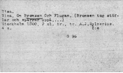 //// Visa. ¦ ' ? //// "Tiiaa, Or Bromsen Och Flugan. (Bronsen tog stöf-lar och spuPraf '"u ppå ,,'..} //// 'Stockholm 1800, ? ol . tr., tr. A.J.Sylvenius. 4 s. 8;o //// 0 96 ////