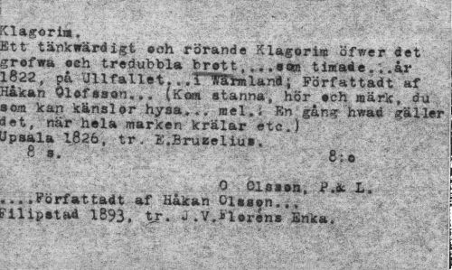 //// ' - *- //// t ¦ - ' //// ^lagoria. //// Ett tänkwärdigt och rörande Klagoriip öfwer det Tefwa eeh tredubbla brett,...»an timaée.'..ar 1822, på Ullfallet.. .nradwlanii Författadt af Håkan Olofsson... (Kom stanna, hör^ ech mark, du som kap k&nslor hysa... mel.; Kn gang hwad galler det, när hela marken krälar etc.) Upsala 1826, tr. E.Bruaelius. //// 8 s. 8:0 //// O Glasen, F.& L. ...Forfattadt af Håkan Gles^n... tTilipstad 1893, tr. 3 .V.ilerens Snka. //// '" \ .v- .• i*-''--'"'-' - *••*• •-¦'-S'-', V." - //// y. y ..¦ ,• ¦ . "-•"'_„•'.;.', * .--v" • -'.v 'x-• AC ¦•>.•"'•'.' • - //// ' . ' V. • * V- •• ¦ --'. W" "j.v'"' " T" ' . .. ' - /V''r'"' v;" ' ..^'V-'-'." v ,: • ^•.'VJ.iäfe ////
