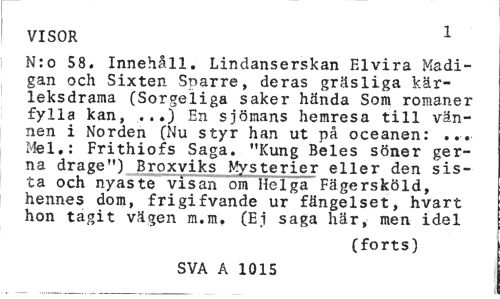 //// VISOR 1 //// N:o 58. Innehåll. Lindanserskan Elvira Madi-gan och Sixten Sparre, deras gräsliga kärleksdrama (Sorgeliga saker hända Som romaner fylla kan, ...) En sjömans hemresa till vännen i Norden (Nu styr han ut på oceanen: ... Mel.: Frithiofs Saga. "Kung Beles söner ger-na dragé") Broxviks Mysterier eller den sista och nyaste visan om Helga Fägersköld, hennes dom, frigifvande ur fängelset, hvart hon tagit vägen m.m. (Ei saga här, men idel //// (forts) //// SVA A 1015 ////