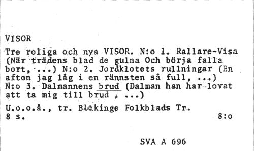 //// VISOR //// Tre roliga och nya VISOR. N:o 1, Rallare-Visa (När trädens blad de gulna Och börja falla bort, N:o 2. Jordklotets rullningar (Hn //// afton jag låg i en rännsten så full, ..,) N:o 3. Dalmannens brud (Dalman han har lovat att ta mig till brud f ...) //// U.o.o.å., tr. Blekinge Folkblads Tr. 8 s. 8:o //// SVA A 696 ////