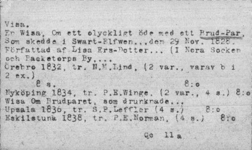 //// Visa, //// Er W i sa; Cm ett ©lyckligt öde med ett Brud-Par, Svn skedde i Swart-Blfwen.«,den 29 KoyTTFST"" Författad af Lisa Ers-Dotter,.. (I Kcra Socken och Eftéksterps By,.., //// Örebro 1832, tr. H.K.Ll»*, (2 var., varav b i 2 ex.) //// 8a. 8:o //// Nyköping 1834-, tr. P.BJBin^e. (2 var., 4 s.) 8:0 Wisa Om Brudparet, som drurkrade... Upsala l63ö, tr. S.P.Lefflcr (4 s») 8:0 Eskilstuna 1838, tr. ?J£.Nornan, {4 8:0 //// qo 11 a ////