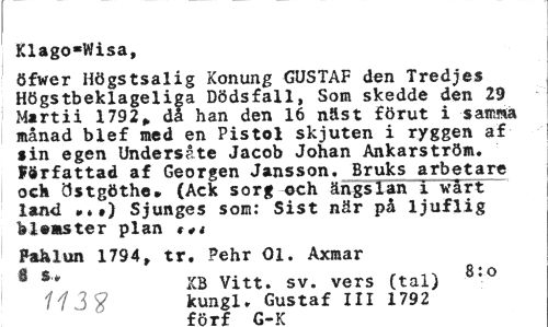//// Klago-Wisa, //// öfwer Högstsalig Konung GUSTAF den Tredjes Högstbeklageliga Dödsfall, Som skedde den 29 Martii 1792* då han den 16 näst förut i samma månad blef med en Pistol skjuten i ryggen af sin egen Undersåte Jacob Johan Ankarström. Författad af Georgen Jansson. Bruks arbetare och dstgöthe» (Ack sorg och ängslan i wärt land »»•) Sjunges som: Sist när på ljuflig blomster plan «#< //// Pahlun 17941 tr. Pehr 01. Axmar //// 8 s'* XB Vitt. sv. vers (tal) 8:0 //// 113% kungl. Gustaf III 1792 //// r.-v ////