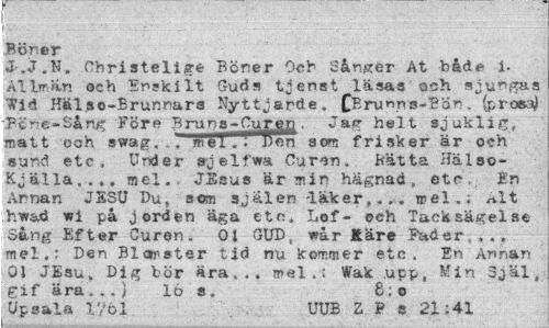 //// Böner //// J.J.N. Christel!ge Böner Och Sånger At bad»8' i-Allmän och Enskilt Guds tjenst läsas oeh sjungas Tid Hälso-Brunnars Nyttjande. CBrun.n s-BÖn . (proe:^ Btne-Sån^ 'För* Bruns-Curtp . Jag helt sjuklig, matt och swag, ... mel.! Ken som frisker är oeh sund etc . Under ajelfwa Curin. Bätta Hälao-Kjälla,... mel., JEsus armin hägnad, etc. fn Annan JESU Du, som själen läker,-,, mel.; nit h-wad wi på jorden äga eto. Lof- och Tacksägelse Sång Efter Ouren. 01 GUD, wår Käre Fader ... mel,: Den Blomster tid nu kommer etc. En Annan OJ JEsu, Dig bör ära... mel.; Wak upp, Min Själ, £if ära.,.} Ib s. 8;o //// Upeala l'/bl UUB Z B e 21:41 ////