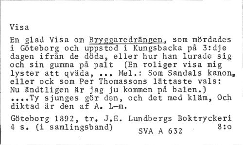 //// Visa //// En glad Visa om Bryggaredrännen. som mördades i Göteborg och uppstod i Kungsbacka på 3:dje dagen ifrån de döda, eller hur han lurade sig och sin gumma på palt (En roliger visa mig lyster att qväda, ... Mel.: Som Sandals kanon, eller ock som Per Thomassons lättaste vals: Nu ändtligen är jag ju kommen på balen.) ...Ty sjunges gör den, och det med kläm, Och diktad är den af A. L-m. //// Göteborg 1892, tr, J.E. Lundbergs Boktryckeri 4 s. (i samlingsband) SVA Å 632 8:0 ////