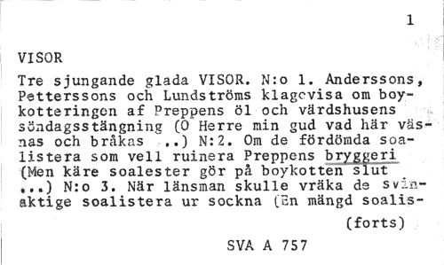 //// 1 //// VISOR //// Tre sjungande glada VISOR. N:o 1. Anderssons, Petterssons och Lundströms klagcvisa om boy-kotteringon af Preppens öl och värdshusens söndagsstängning (0 Herre min gud vad här väsnas och bråkas ,.) N:2. Om de fördömda soa-listera som vell ruinera Preppens bryggeri (Men käre soalester gör på boykotten slut //// N:o 3. När länsman skulle vräka de svin-akt i ge soalistera ur sockna (En mängd soalis- //// (forts) //// SVA A 757 ////