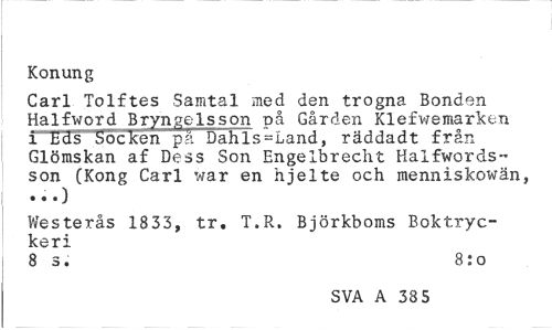 //// Konung //// Carl Tolftes Samtal med den trogna Bonden Halfword Bryngelsson på Gården Klefwemarken i Eds Socken på Dahls-Land, räddadt från Glömskan af Dess Son Engelbrecht Halfwords-son (Kong Carl war en hjelte och menniskowän, //// -O //// Westerås 18 33, tr. T.R. Björkboms Boktryckeri //// 8 s. 8:o //// SVA A 38 5 ////