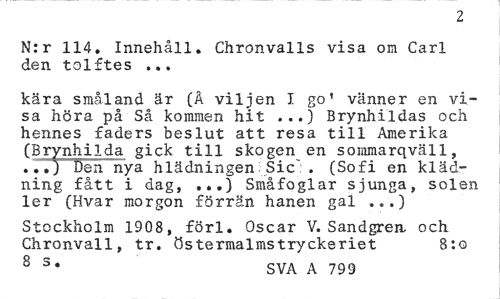 //// 2 //// N:r 114. Innehåll. Chronvalls visa om Carl den tolftes ... //// kära smaland är (Å viljen I go' vänner en visa höra på Så kommen hit ...) Brynhildas och hennes faders beslut att resa till Amerika (Brynhilda gick till skogen en sommarqväll, ..,) Deh nya hlädningen;Sic" . (Sofi en kläd-ning fått i dag, ...) Småfoglar sjunga, solen ler (Hvar morgon förrän hanen gal ...) //// Stockholm 1908, förl. Oscar V.Sandgren och Chronvall, tr. östermalmstryckeriet 8:o //// 8 3* SVA A 799 ////
