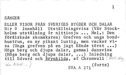 //// 1 //// SÅNGER //// ELLER VISOR FRÅN SVERIGES BYGDER OCH DALAR N:r 0 Innehåll Utställningsvisa (Vår Stockholms utstälning år nittiosju ... Mel.: Den förälskade skomakaren) Grefven och unga bondhustrun, en ny pikant lustig, men vacker visa (Unga grefven på en jagt Kände törst ...) Höga berg och djupa dalar, gammal dansvisa (Höga berg och djupa dalar, ...) Inledning till Edvard och Brvnhilda. af Chronwall C He// //// A/ord... i (forts) //// SVA A 271 J ////