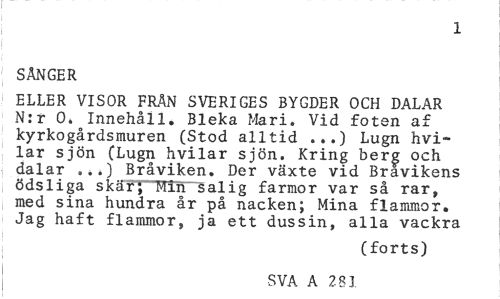 //// 1 //// SÅNGER //// ELLER VISOR FRÄN SVERIGES BYGDER OCH DALAR N:r O» Innehåll. Bleka Mari. Vid foten af kyrkogårdsmuren (Stod alltid ...) Lugn hvi-lar sjön (Lugn hvilar sjön. Kring berg och dalar ...) Bråviken. Der växte vid Bravikens ödsliga skär; Min salig farmor var så rar, med sina hundra år på nacken; Mina flammor. Jag haft flammor, ja ett dussin, alla vackra //// (forts) //// SVA A 281 ////
