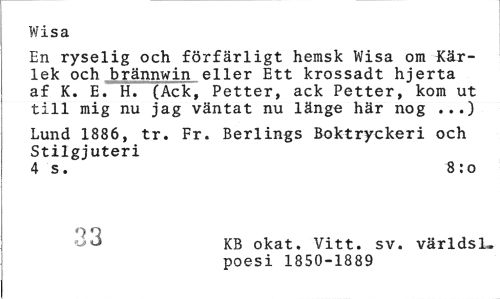 //// Wisa //// En ryselig och förfärligt hemsk Wisa om Kärlek och brännwin eller Ett krossadt hjerta af K. E. H. (Ack, Petter, ack Petter, kom ut till mig nu jag väntat nu länge här nog ...) //// Lund 1886, tr. Fr. Berlings Boktryckeri och Stilgjuteri //// 4 s. «:o //// 9 Q //// v>o KB okat. Vitt. sv. världsl. //// poesi 1850-1889 ////