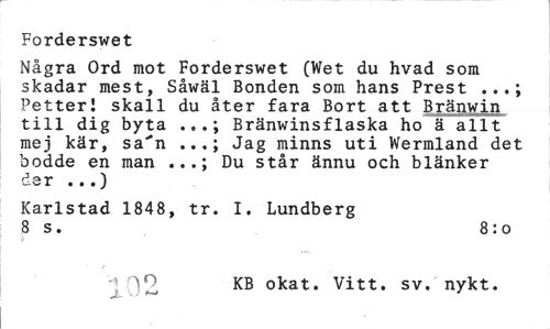 //// Forderswet //// Några Ord mot Forderswet (Wet du hvad som skadar mest, Såwäl Bonden som hans Prest PetterI skall du åter fara Bort att Bränwin till dig byta Bränwinsflaska ho ä allt //// mej kär, sa'11 Jag minns uti Wermland det //// bodde en man ...; Du står ännu och blänker de r ...) //// Karlstad 1848, tr. I. Lundberg //// 8 s. 8:0 //// -j Q9 KB okat. Vitt. sv. nykt. ////