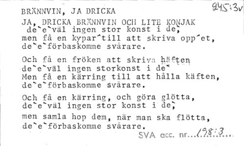 //// BRÄNNVIN, JA DRICKA 6V //// JA, DRICKA BRÄNNVIN OCH LITE KONJAK //// de^e^väl ingen stor konst i de^ men få en kypar^till att skriva opp^et, de^e^förbaskomme svårare. //// Och få en fröken att skriva häften de^evväl ingen storkonst i de" Men få en kärring till att hålla käften, deve"förbaskomme svårare. //// Och få en kärring, och göra glötta, de^e^väl ingen stor konst i de^ //// men samla hop dem, när man ska flotta, de^e^förbaskomme svårare. >a<?--? //// SVA acc. nr...v... ////