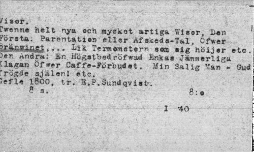//// risor. //// !w«nne helt nya och rayeket artiga Wiatr, Den 1'Örata; Parentatian eller Af skede-Tal, Cfwer //// »«• « ^ik Termometern som alg höijer etc. )er, Andra; i.n Högatbed rofwad Enkas Jämmerliga llagan Öfwer Caf fe-Förbudet. Min Salig Man - Gud 'rogde själen! etc. refie 1800, tr. B.P.Sundqviat-. //// 8 a. 8:0 //// I "40 ////