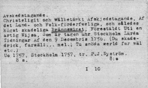 //// Avsked stagande , //// Christeligit och välbetänkt Af skj ed stagande , Af det Land- och Folk-f örderfvel iga , och således högst skadeliga . Förestäldt Uti en //// artig Wijsa, Som år tagen uhr Stockholm Lärda Tidningar Af den 9 Pecemtris 1756. (Du skade-drick, farväl!.v., mel.; Tu snöda werld far väl etc.) //// Uo 17*7, Stockholm 1757, tr. P.J .Hy »tröm . 8 s. 8; • //// 1 10 //// t : ////
