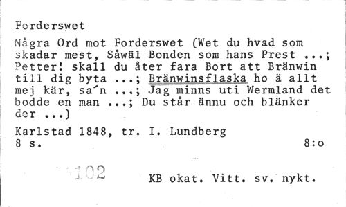//// Forderswet //// Några Ord mot Forderswet (Wet du hvad som skadar mest, Såwäl Bonden som hans Prest . Petter! skall du åter fara Bort att Bränwin till dig byta Bränwii^sflaska ho ä allt //// mej kär, sa'n Jag minns uti Wermland det //// bodde en man Du står ännu och blänker //// der ...) //// Karlstad 1848, tr. I. Lundberg 8 s. 8:0 //// • no //// ^ KB okat. Vitt. sv. nykt. ////