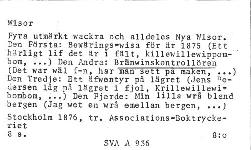 //// Wisor //// Fyra utmärkt wackra och alldeles Nya Wisor. Den Första: 3ewärings=wisa för är 1875 (Ett härligt lif det är i fält, killewillewippom-bom, .,.) Den Andra: Bränwinskontrollören (Det war wäl f-n, har man sett på maken,"...) Den Tredje: Ett äfwentyr på lägret (Jens ?e-dersen låg på lägret i fjol, Krillev/illewi= bombom, ...) Den Fjerde: Min lilla wrå bland bergen (Jag wet en wrå emellan bergen, ...J //// Stockholm 1876 , tr. Associations=Boktryclce-riet //// 8 s. 8:o //// SVA A 936 ////