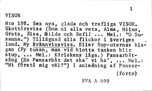 //// 1 //// VISOR //// N:o 100„ Sex nya, glada och trefliga VISOR. Skottårsvisa (Som ni alla veta, Alma, Hilma, Greta, Elsa, Bilda och Sofi! ... Mel.: "0 Susanna.") Tillägnad alla flickor i Sveriges land. Ny Brännvinsvisa. Eller Sup-uternas klagan (fy tusan, man vid blotta tanken blir stup, ... Mel-.: Kärlekens låga.) Pansarbåt-sång (En Pansarbåt det ska"* vi ha', ... Mel.: "Ni förstå mig väl?") I anledning af Pansar- //// (forts) //// SVA A 699 ////