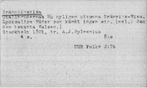 //// .Brännvin avi sa //// "JtåS. Nu nyligen utkomna I? rar w i s -'-Vi si, //// Lyckaall ge Fäder 3 or; känd t ingen etr. (Tel.; San den Yekanta Walsen.) Stockholm l301, tr. A..J. Sylvenius //// 4 3, 8;o //// UUE Folkv 2;76 ////