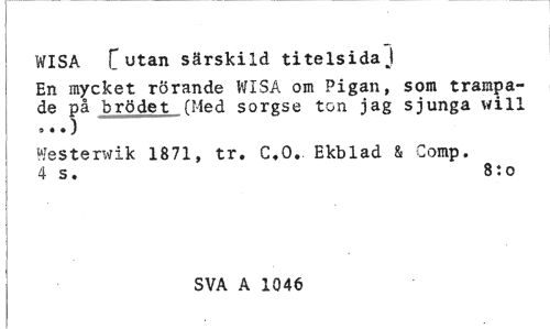 //// WISA C utan särskild titelsidaj //// En mycket rörande WISA om Pigan, som trampade på brödet (Med sorgse ton jag sjunga will //// 3> • • ) //// Westerwik 1871, tr. C.O.. Ekblad & Comp. 4 s. 8:0 //// SVA A 1046 ////