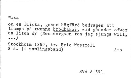 //// Wisa //// om en Flicka, genom högfärd bedragen att trampa på twenne brödkakor, wid gåendet öfwer en liten dy (Med sorgsen ton jag sjunga will, • • •) //// Stockholm 1859, tr. Eric Westrell 8 s. (i samlingsband) 8:0 //// SVA A 591 ////