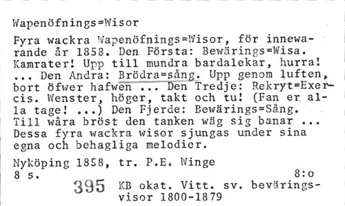 //// Wapenöfnings-Wisor //// Fyra \vackra Wapenöfnings=Wisor, för innewa-rande år 1858. Den Första: Bewärings=Wisa. Kamrater! Upp till mundra bardalekar, hurral ... Den Andra: Brödra=sång. Upp genom luften, bort Öfwer hafwen 7TT Den Tredje: Rekryt=Exer-cis. Wenster, höger, takt och tul (Fan er alla tagel Den Fjerde: Bei\rärings=Sång. Till wåra bröst den tanken wäg sig banar ... Dessa fyra wackra wisor sjungas under sina egna och behagliga melodier. //// Nyköping 1858, tr. P.E. Winge 8 s. ^ 8:o //// 395 KB okat. Vitt. sv. bevärings-visor 1800-1879 ////