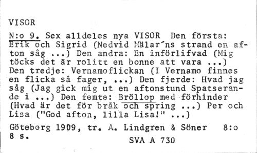 //// VISOR //// N:o 9. Sex alldeles nya VISOR Den första: Erik och Sigrid (Nedvid Mälarens strand en afton såg ...) Den andra: En införlifvad (Mig töcks det är rolitt en bonne att vara ...) Den tredje: Vernamoflickan (I Vernamo finnes en flicka så fager, .„.) Den fjerde: Hvad jag såg (Jag gick mig ut en aftonstund Spatseran-de i ...) Den femte: Bröllop med förhinder (Hvad är det för bråk och spring ...) Per och Lisa ("God afton, lilla Lisa."» ...) //// Göteborg 1909, tr. A, Lindgren & Söner 8:0 //// 8 S* SVA A 730 ////